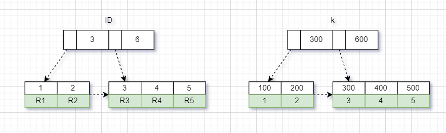 每行的数据分别用:R1, R2, R3, R4, R5 所表示,上面的表会以 id 和 k 两个为索引分别创建两个索引树,类似下图所示: